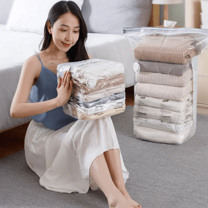 Optimisez votre espace de rangement avec les sacs de compression sous vide. Grâce à leur technologie simple et efficace, réduisez jusqu’à 80% du volume de vos vêtements, couettes et linges de maison.
