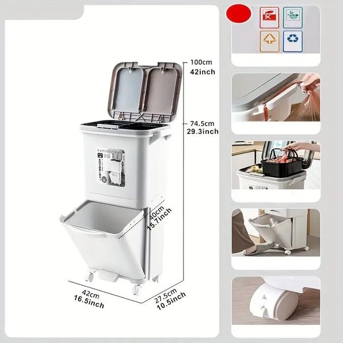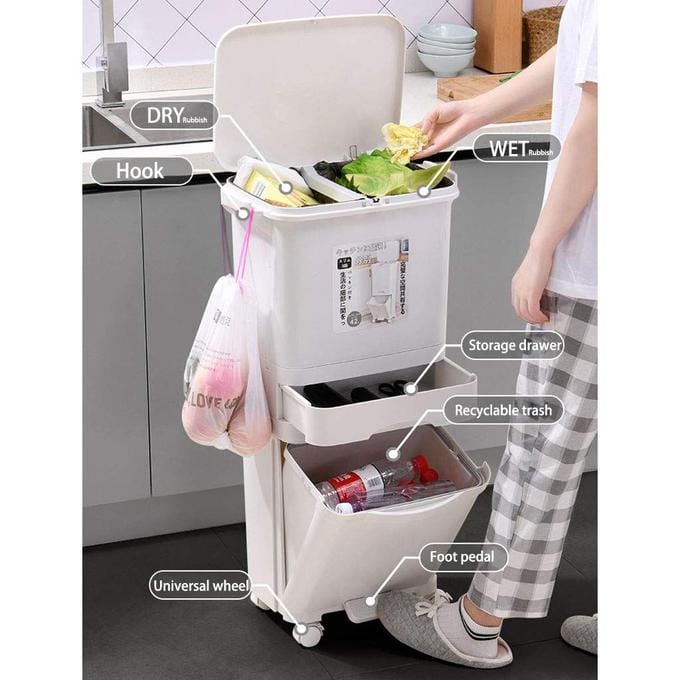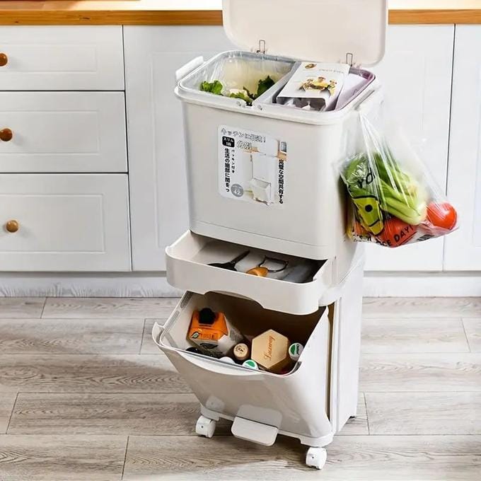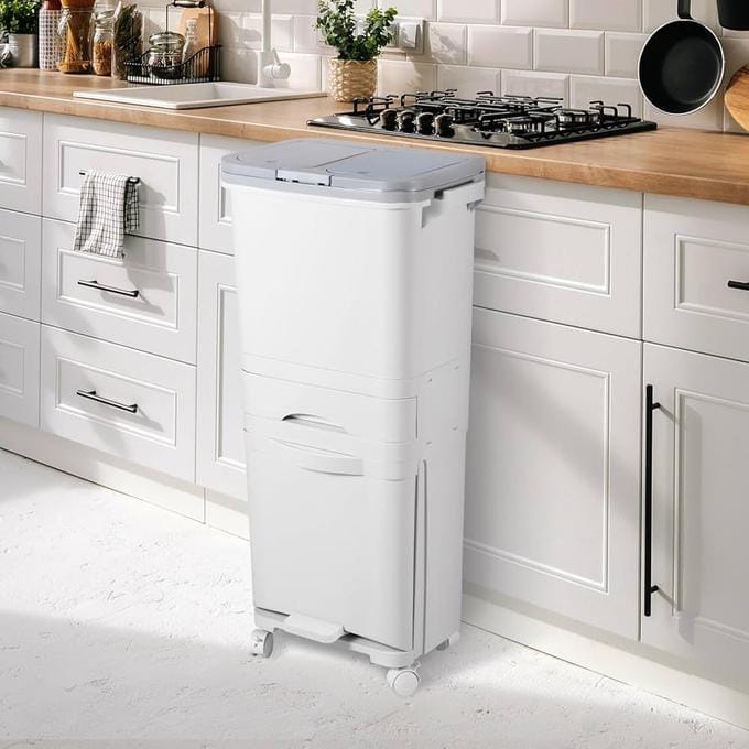 Design moderne : La poubelle est conçue de manière pratique, avec des étagères pour maintenir la propreté de votre cuisine.